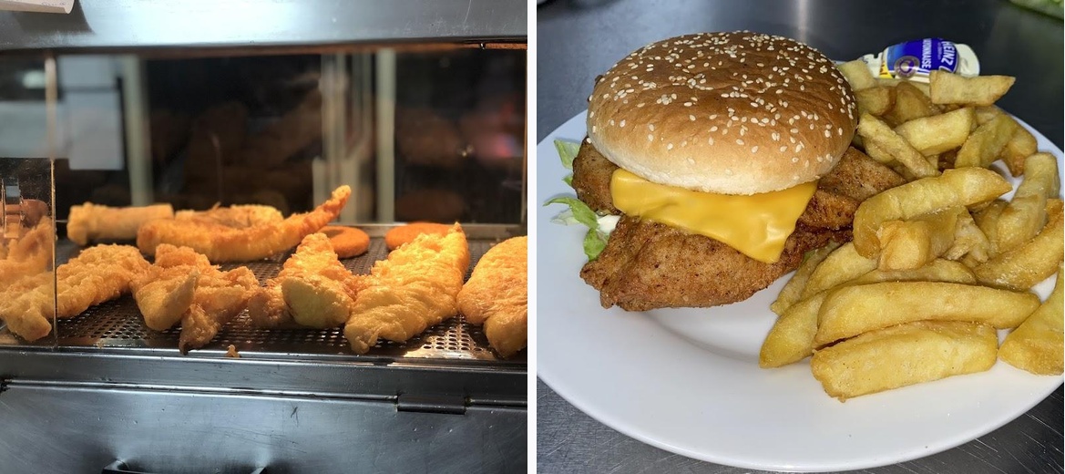Gilders Fish Place specializes in fish and chips, burgers, and chicken dishes, along with vegetarian options and traditional Pukka Pies.